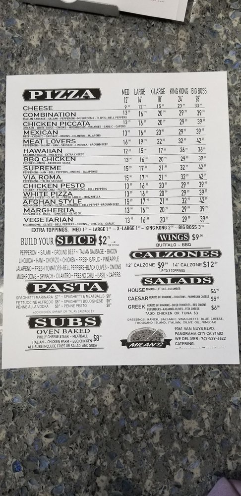 Welcome to Milan’s Pizzeria, a culinary gem located at 9061 Van Nuys Blvd, Panorama City, CA. This charming eatery is famous for its delicious pizzas and mouthwatering chicken wings. The menu offers an enticing selection, from the Nonna's Pasta Bowl featuring succulent shrimp and garlic to satisfying classics like Cheese Ravioli paired with homemade marinara.
